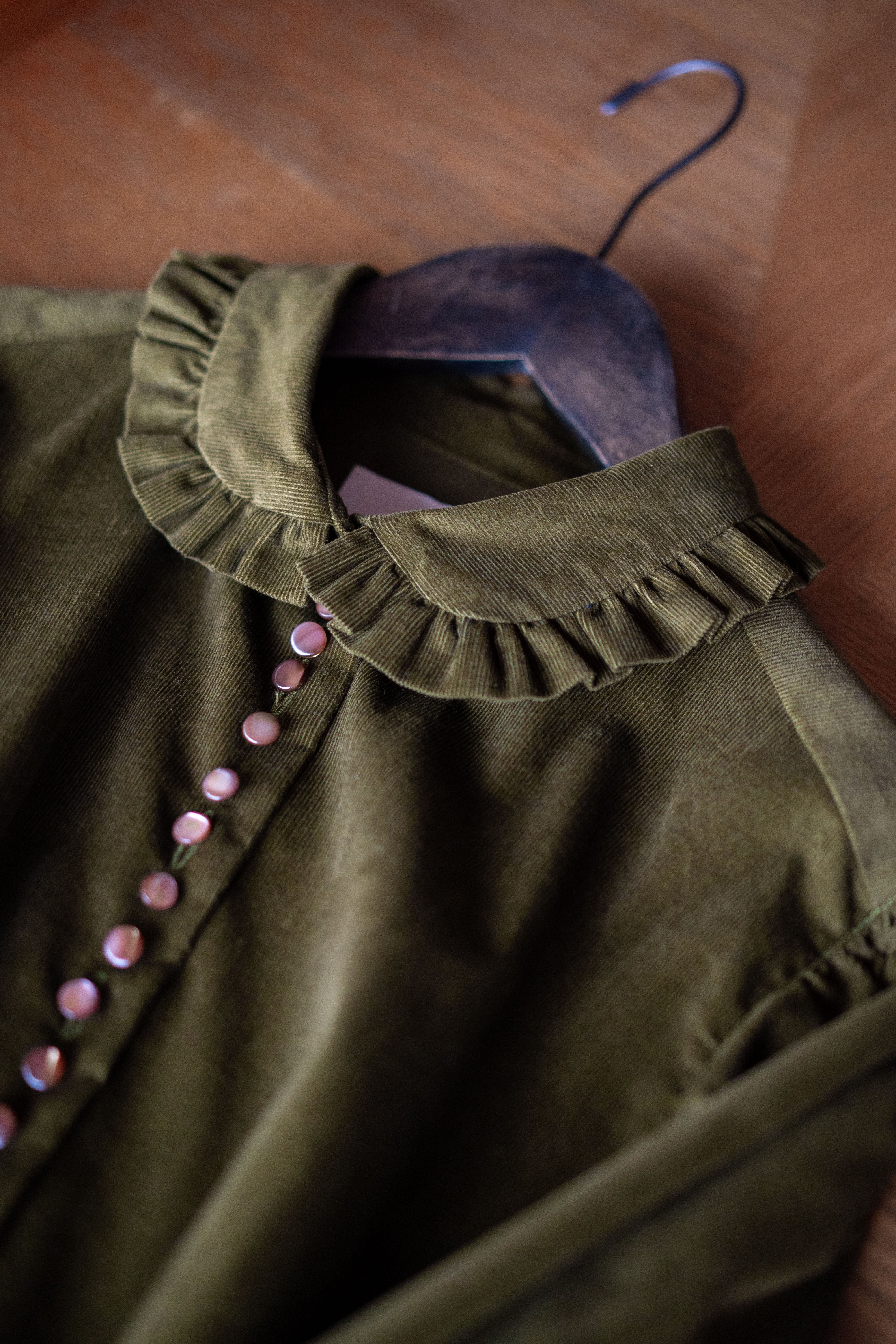 衿と袖口には可愛くなりすぎないフリルを。袖はギャザースリーブとなっています。