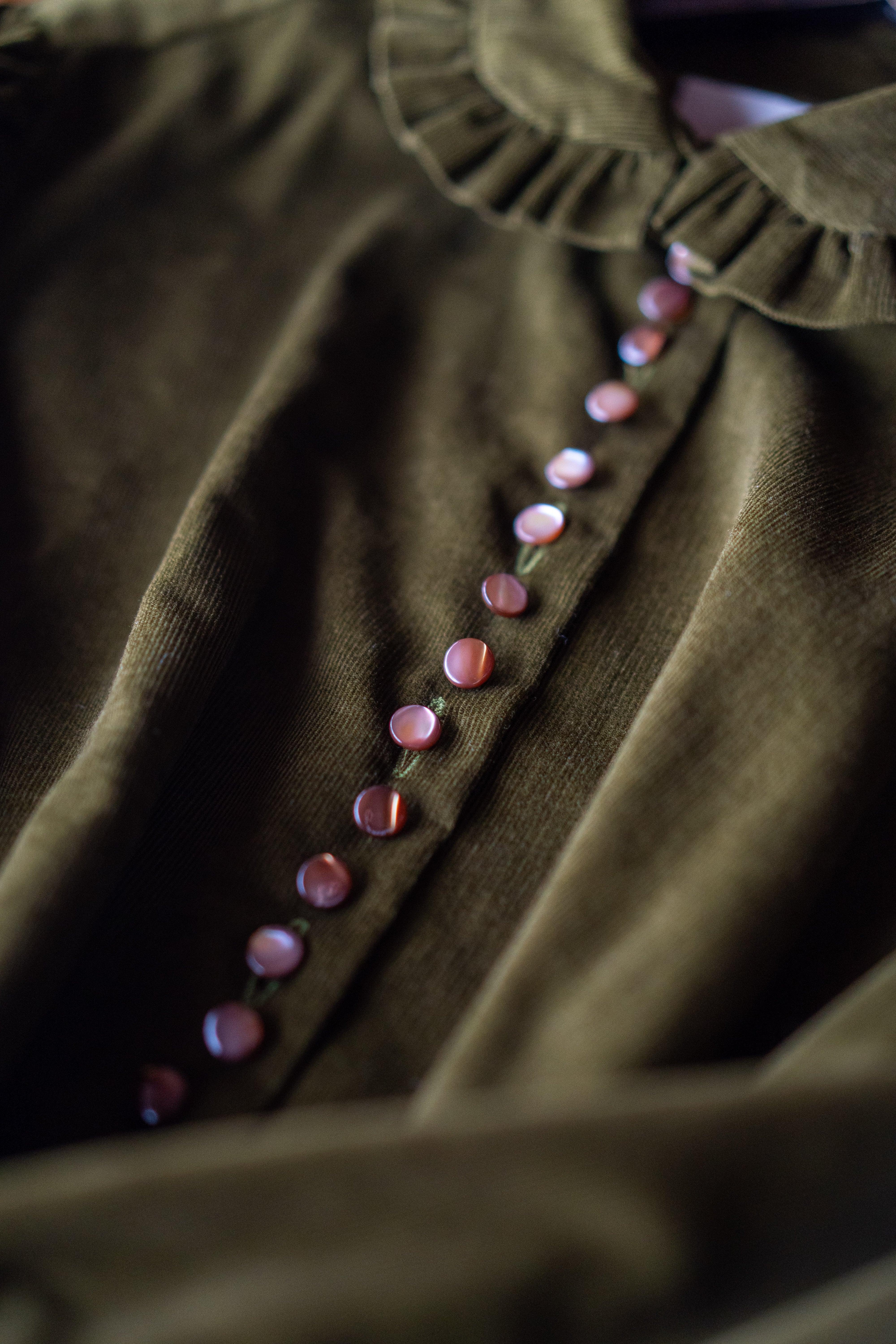 ボタンは天然の貝を使った丸い宝石のようなボタンを使いました。