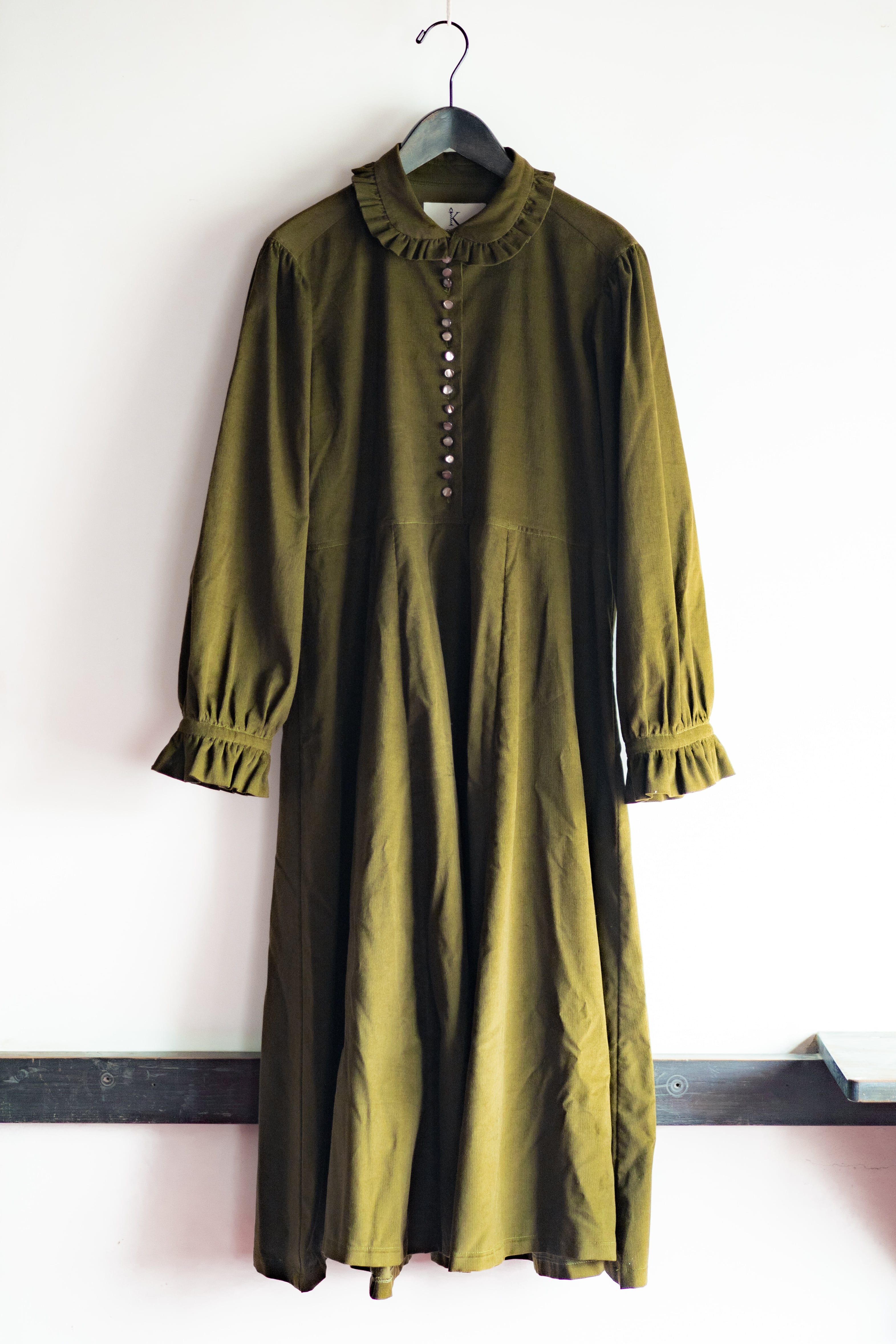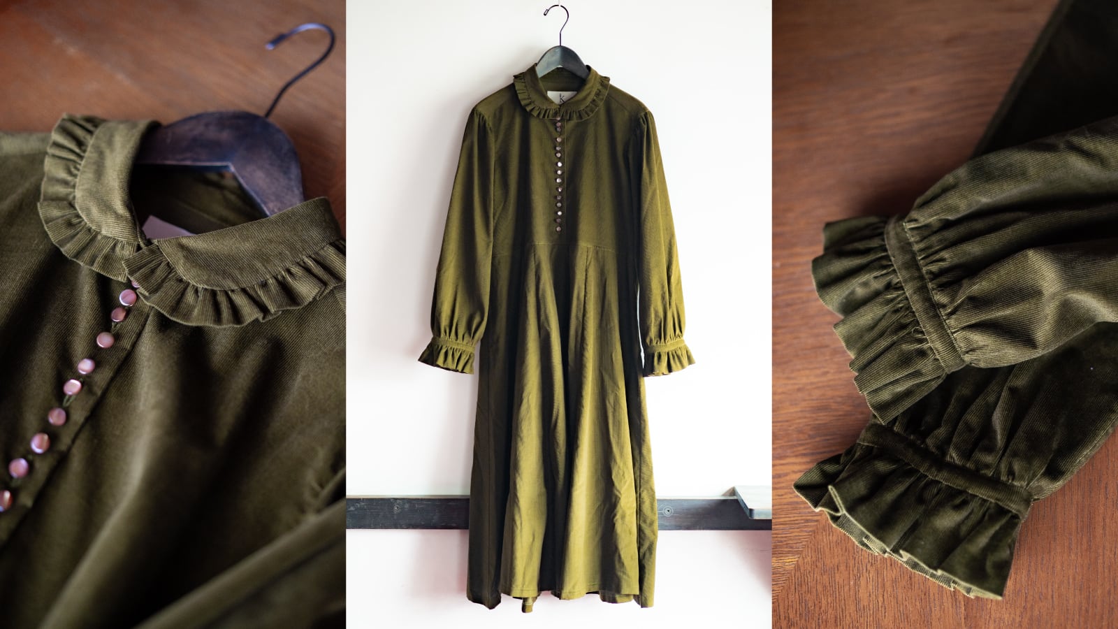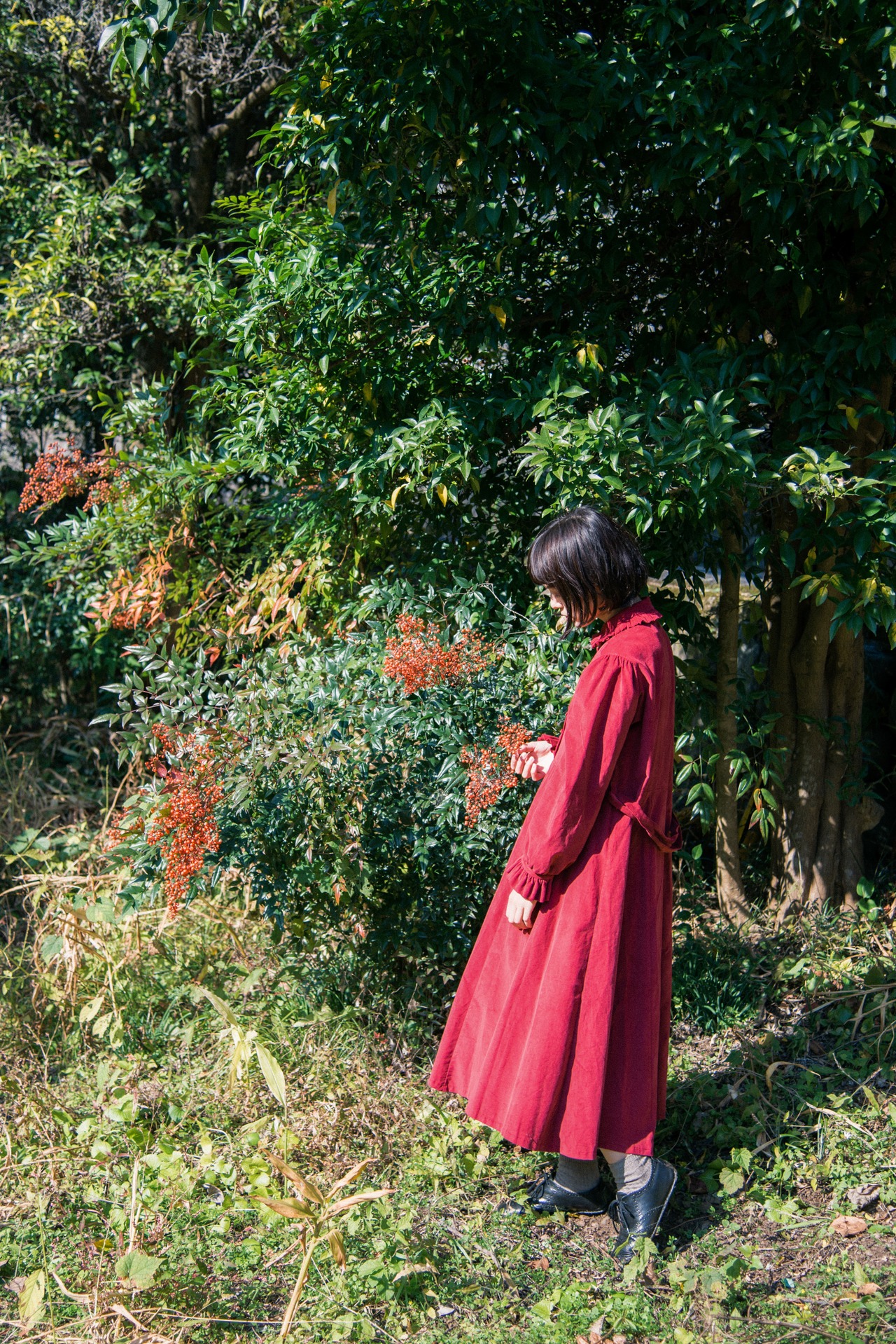 森を渡る冬の道すがら、冷たい風の中でふと射す陽だまり。木々の彩りと共に、その一瞬のあたたかさを纏うワンピース。