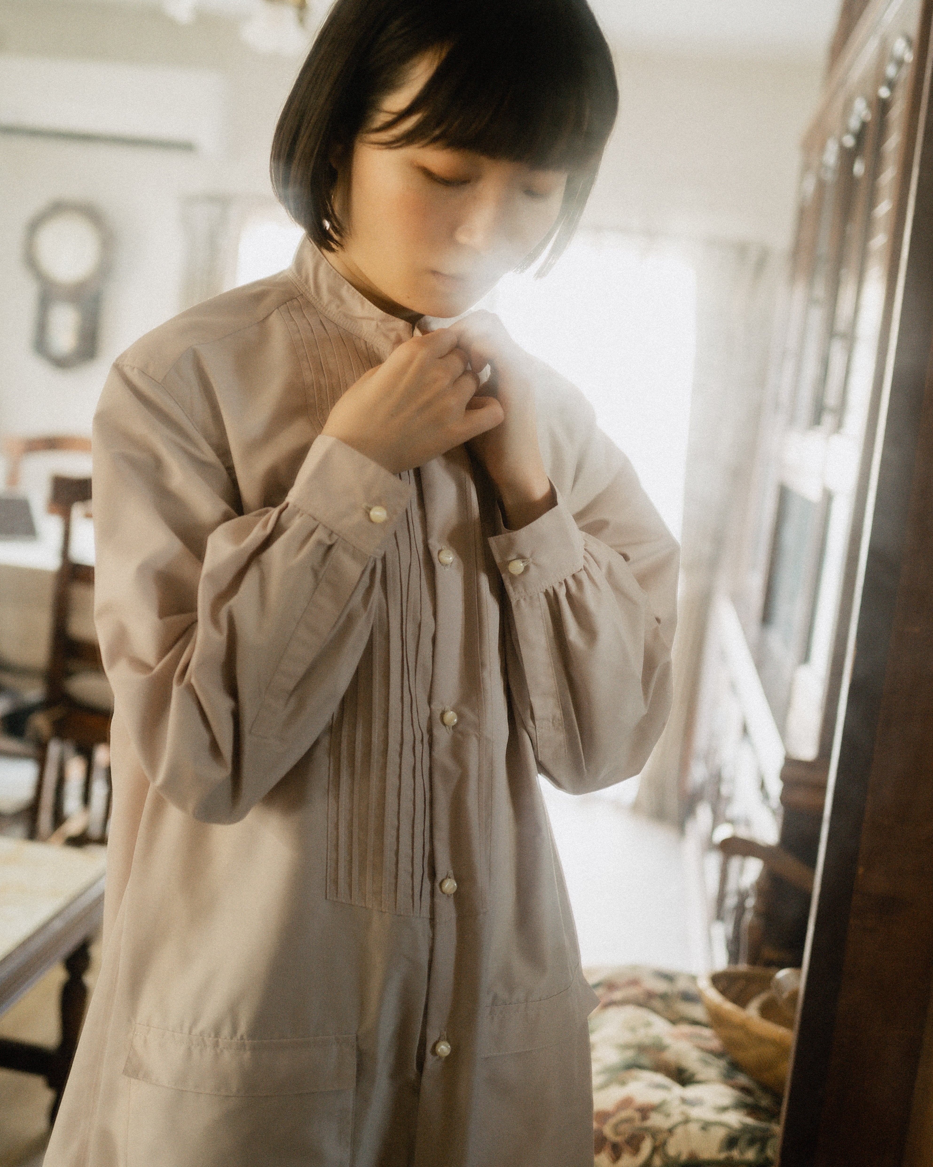 首元はスタンドカラーですっきりと凛としたデザインにしています。