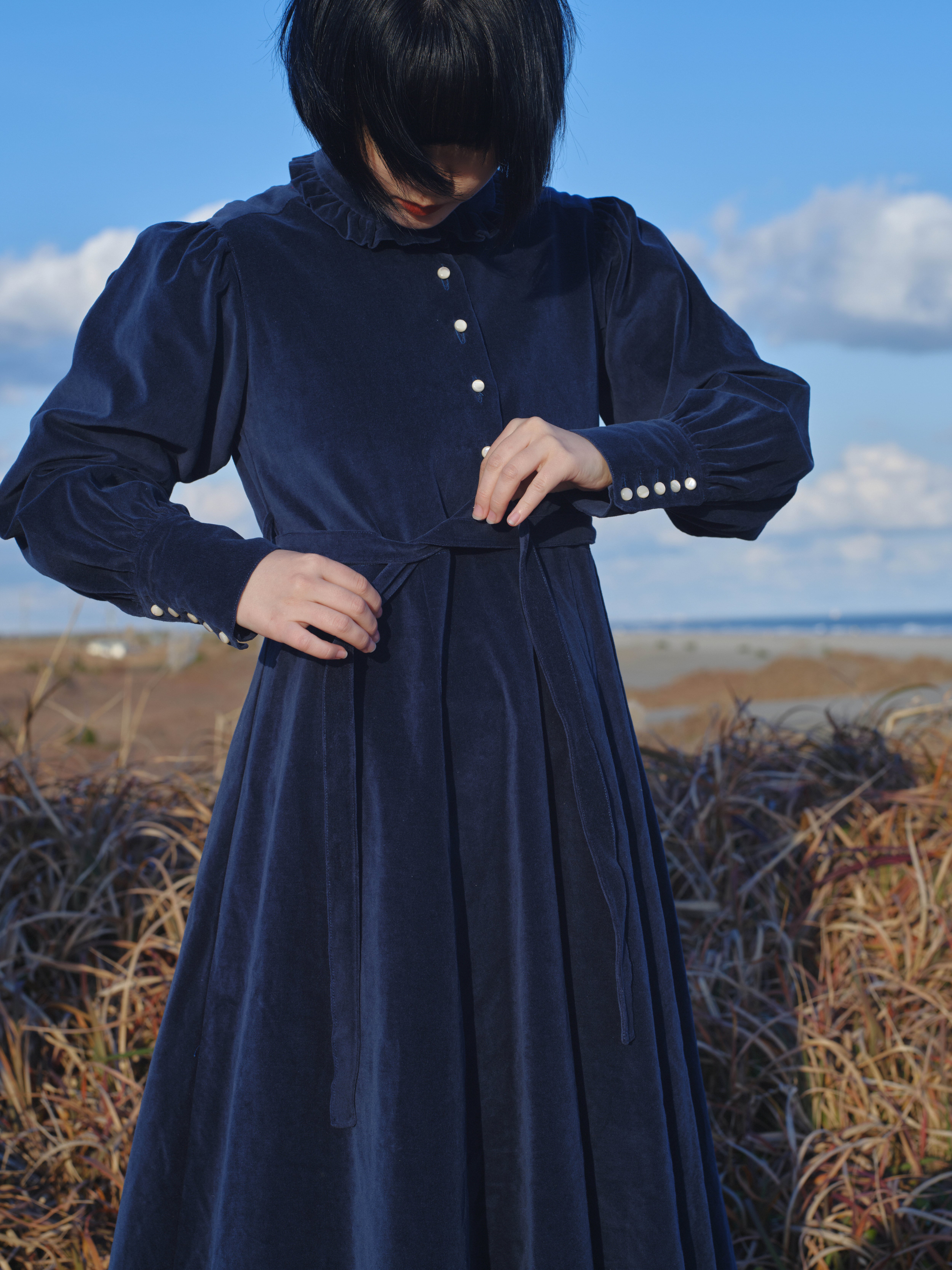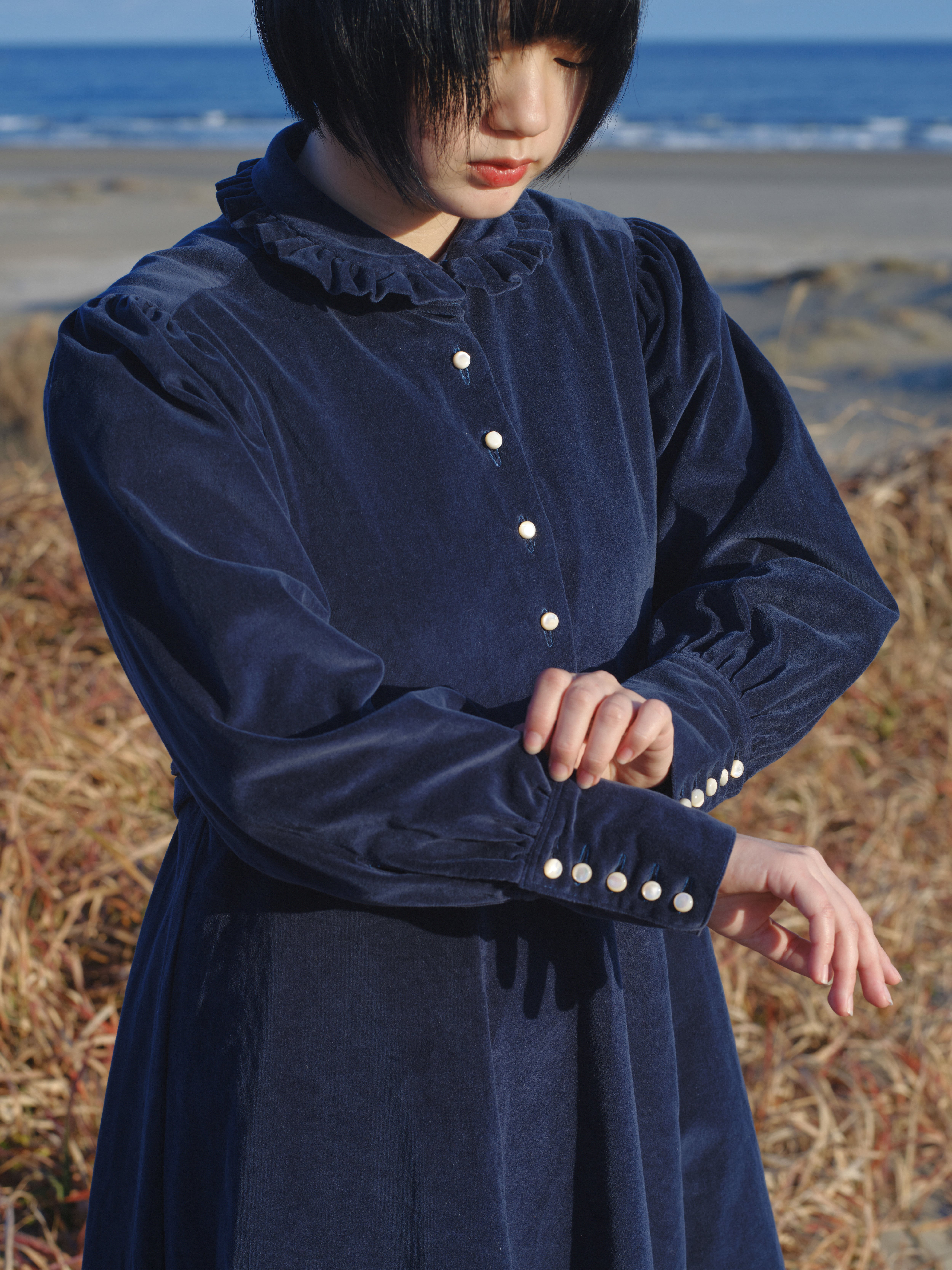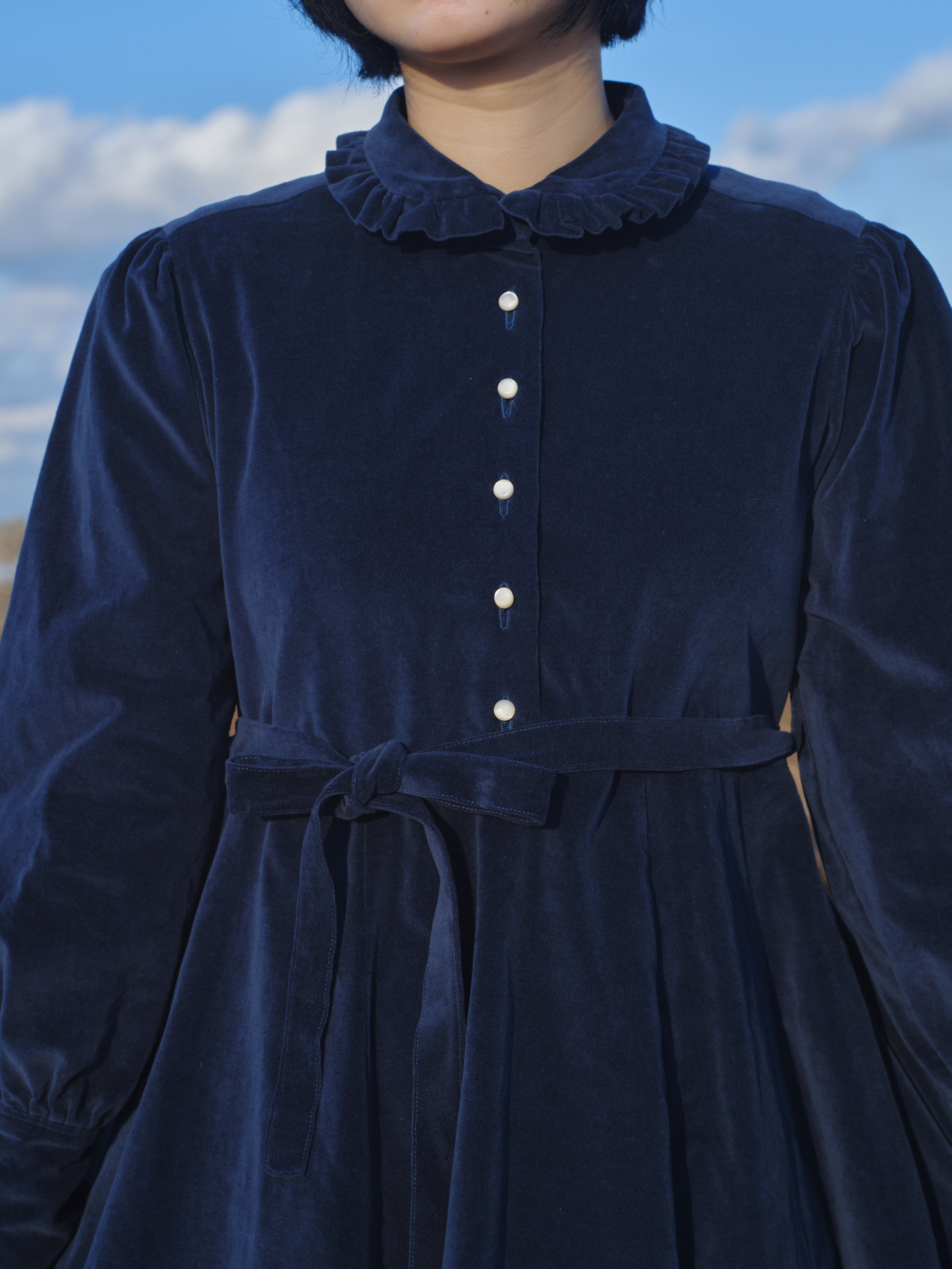 衿には可愛くなりすぎないフリルを。袖口は長めのカフスと天然貝のボタンを宝石のようにあしらいました。付属の紐でシルエットを気分で変えてみてください。