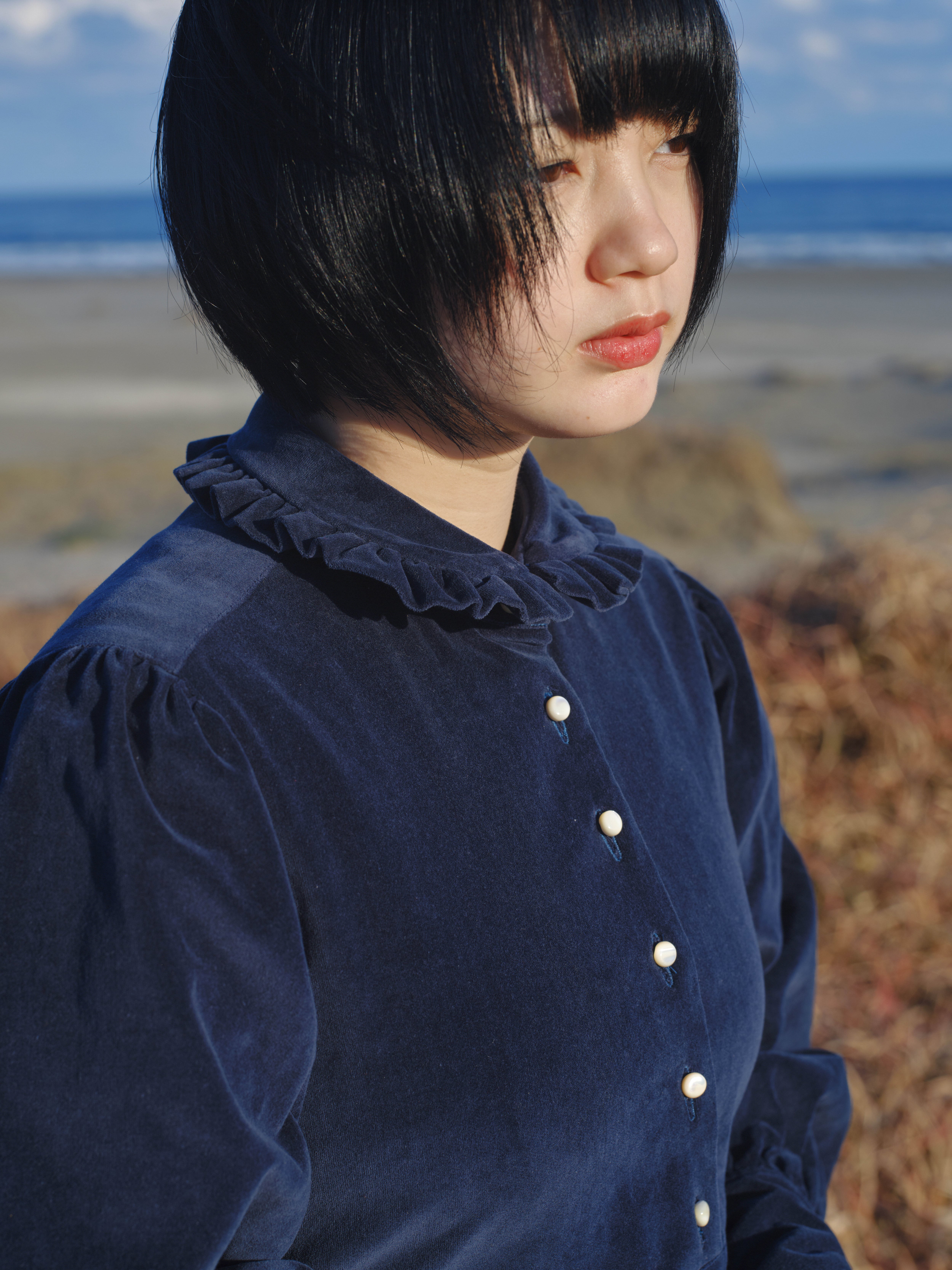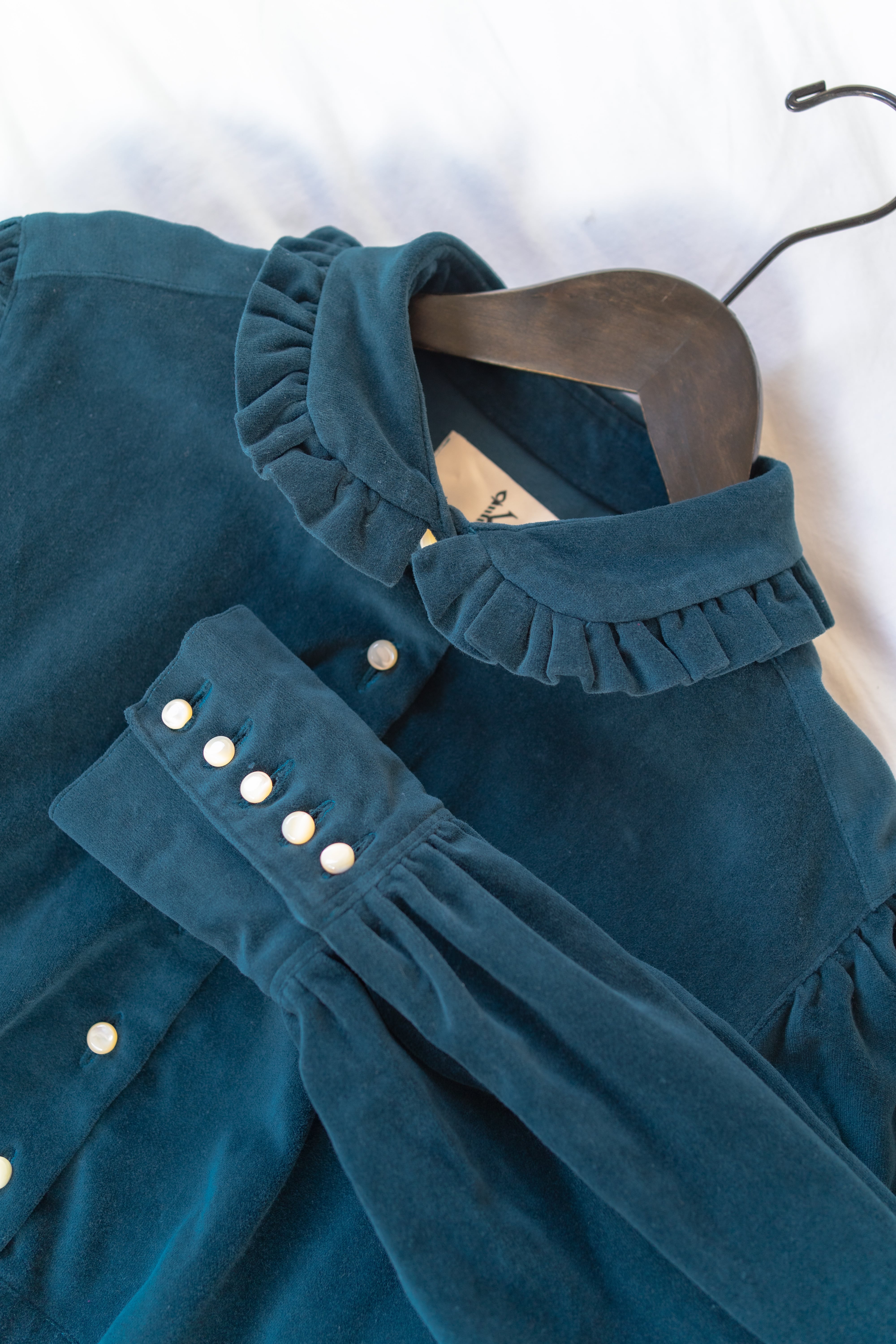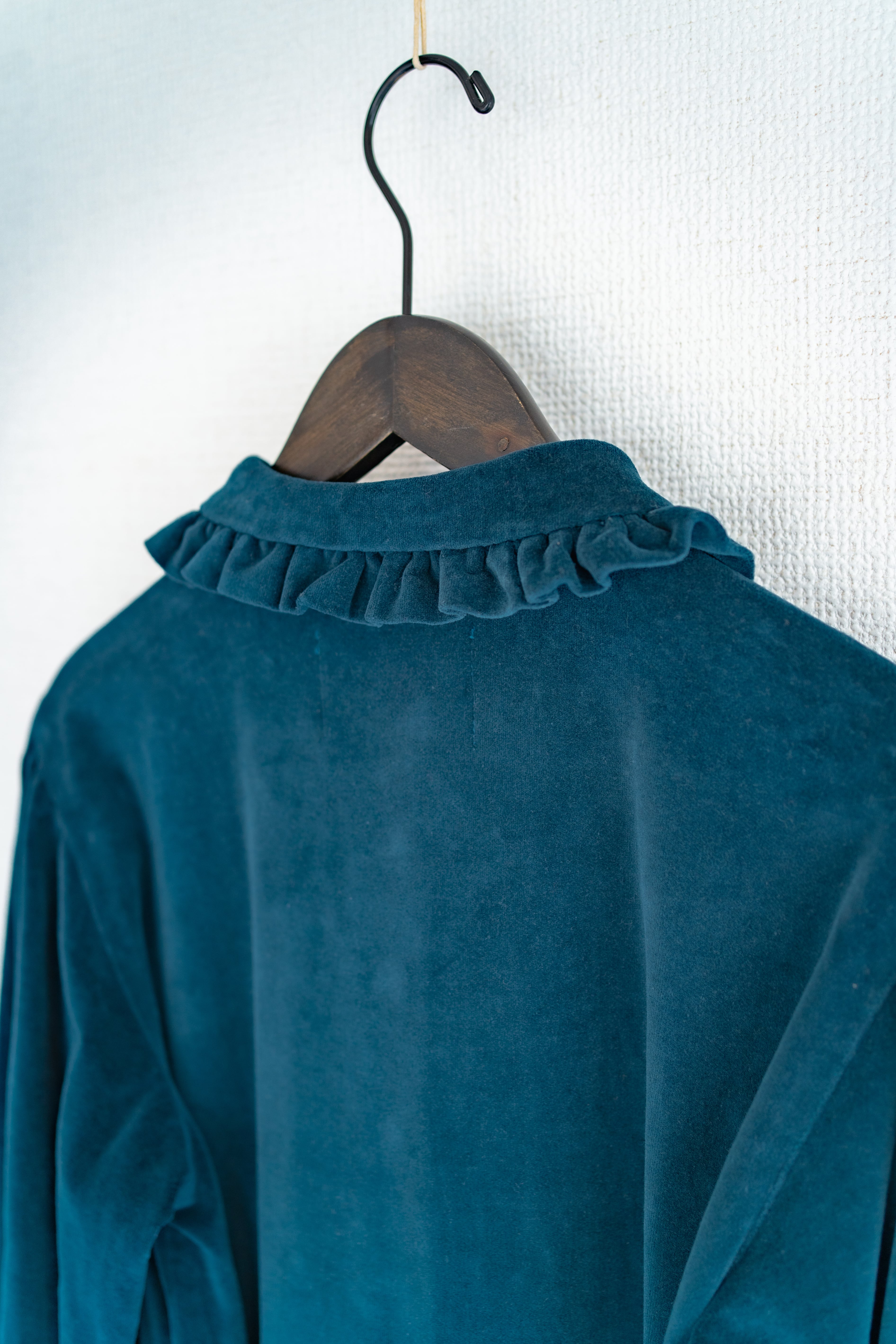 衿には可愛くなりすぎないフリルを。袖口は長めのカフスと天然貝のボタンを宝石のようにあしらいました。付属の紐でシルエットを気分で変えてみてください。