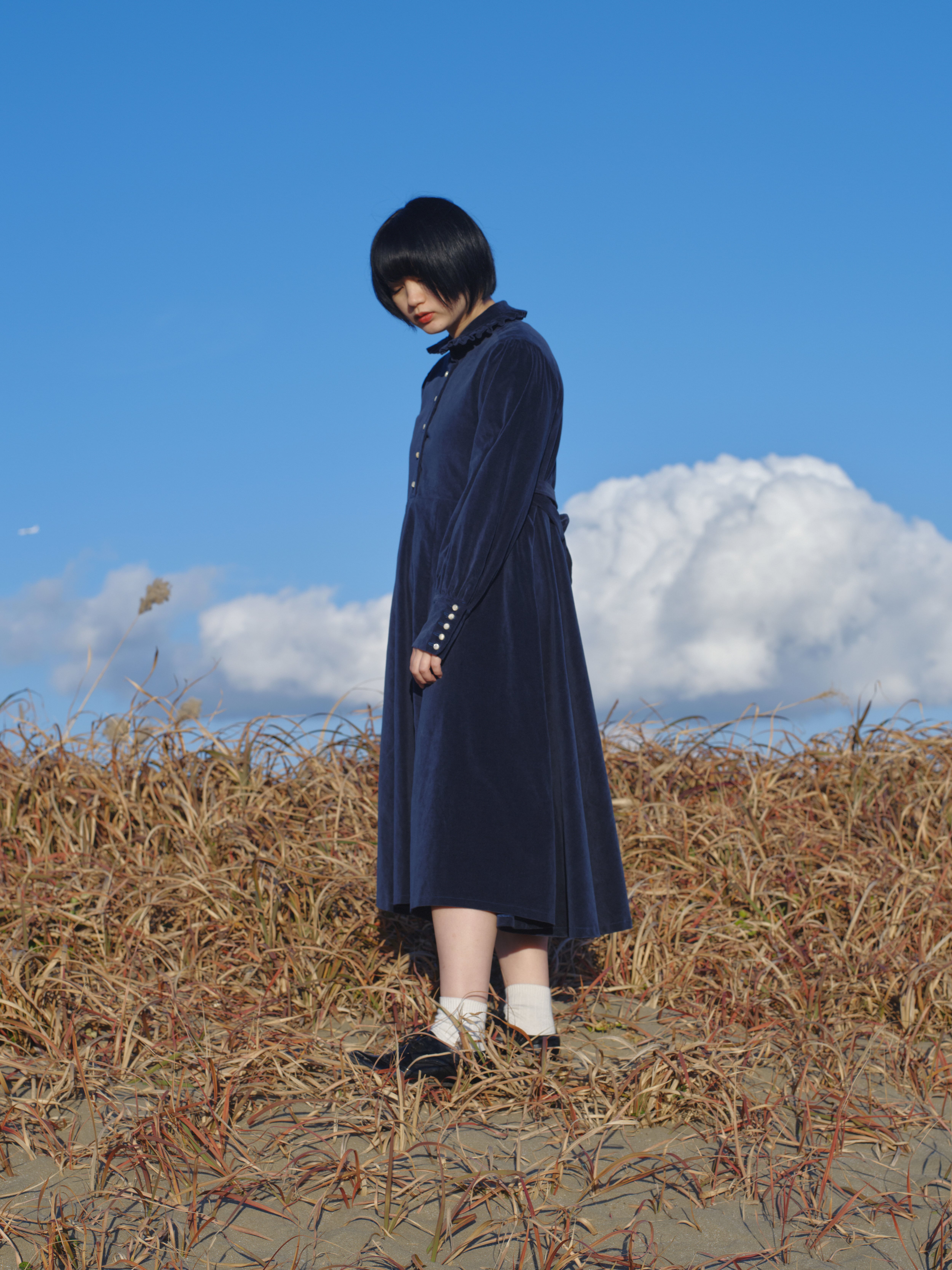 冬空の下、暖かい陽だまり、木々の色彩、冬の寒さの中にも時折感じる暖かなひとときを落とし込んだ冬空模様のワンピースから、特別なワンピースが生まれました。